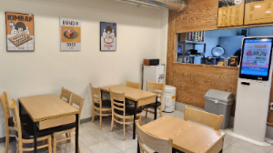 4. 정리된 내부와 테이블 3개, 김밥과 함께 셀프 조리대에서 라면도 즐길 수 있습니다.